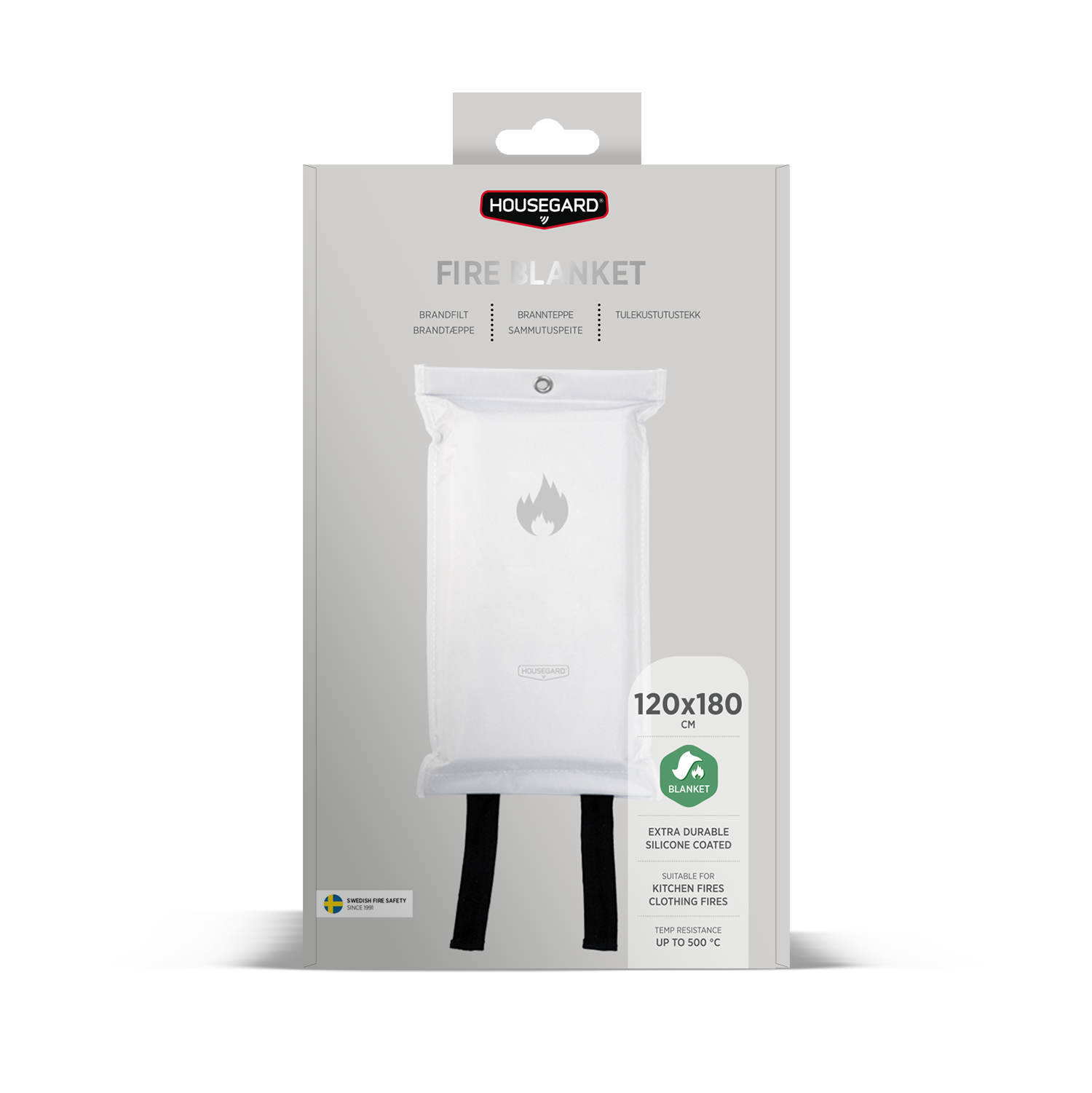 Housegard brannteppe 120 x 180 cm er et praktisk supplement til brannslukkeren, som først og fremst slukker mindre branner på komfyr, i møbler, klær og mennesker. Å kvele flammen med et brannteppe er veldig effektivt, og krever mindre saneringsarbeid.