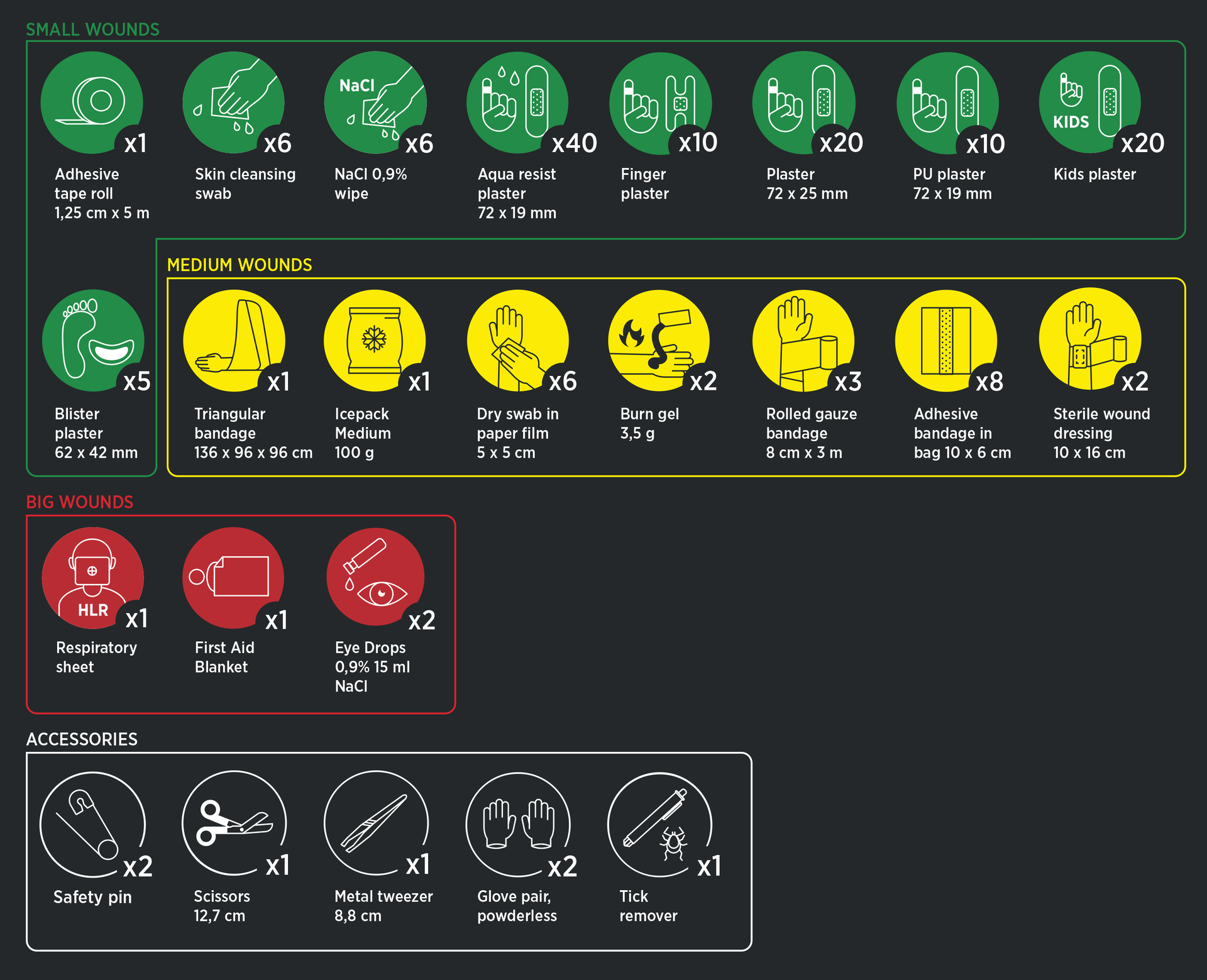 - Inneholder alt som trengs for å håndtere både små og større skader