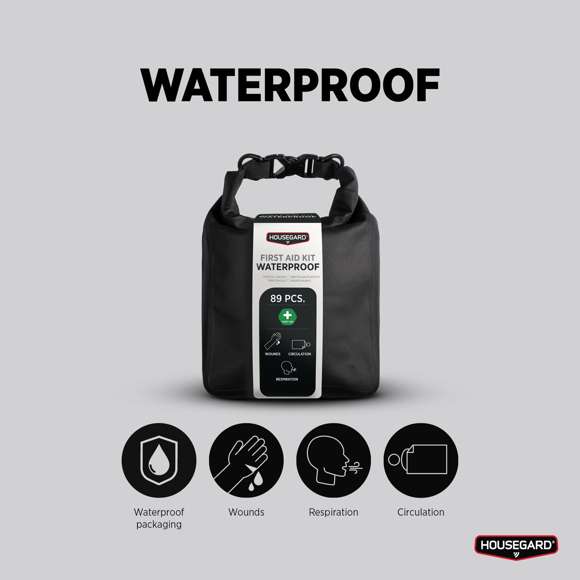 Housegard Waterproof er en vanntett førstehjelpsveske som inneholder de grunnleggende nødvendighetene for å håndtere små og middels store sår i alle værforhold. Perfekt for friluftsliv, båtliv eller for alle situasjoner der vesken kan utsettes for fukt.